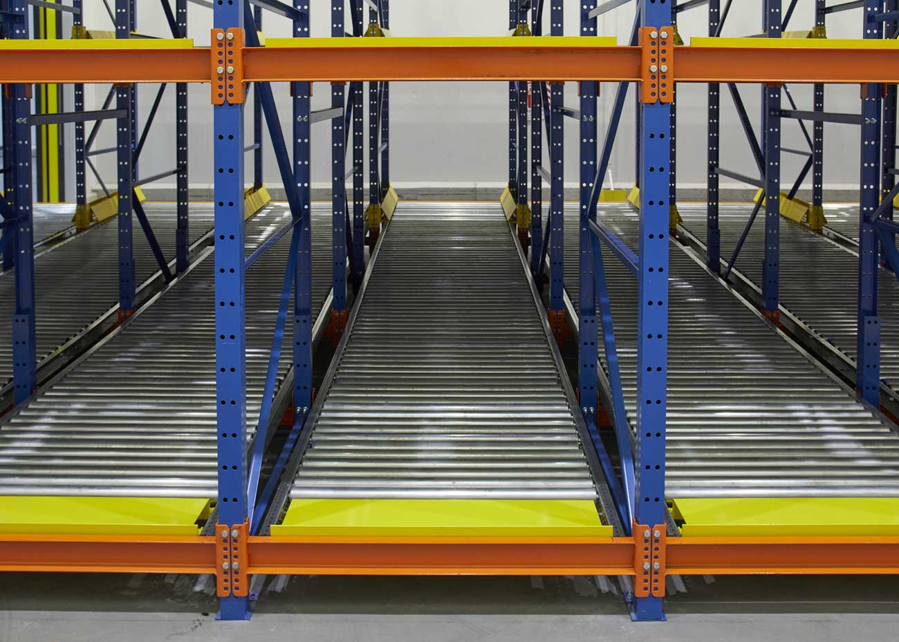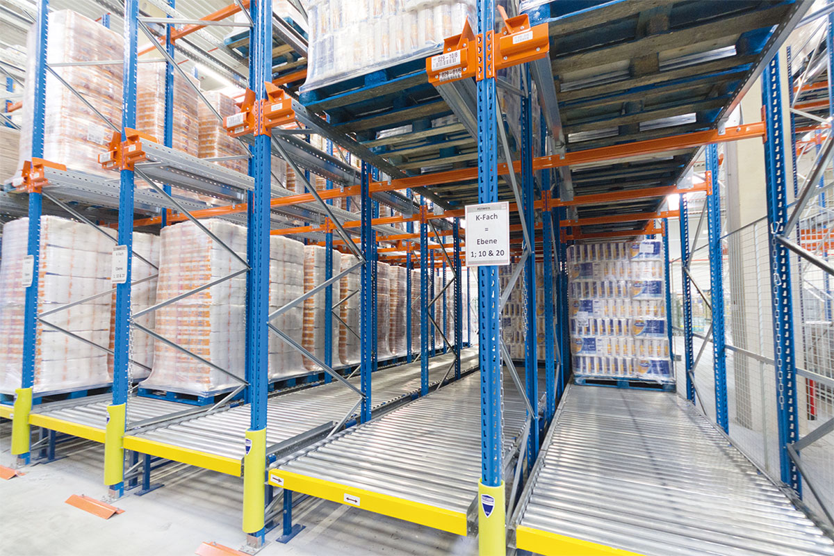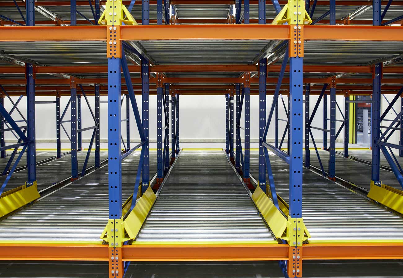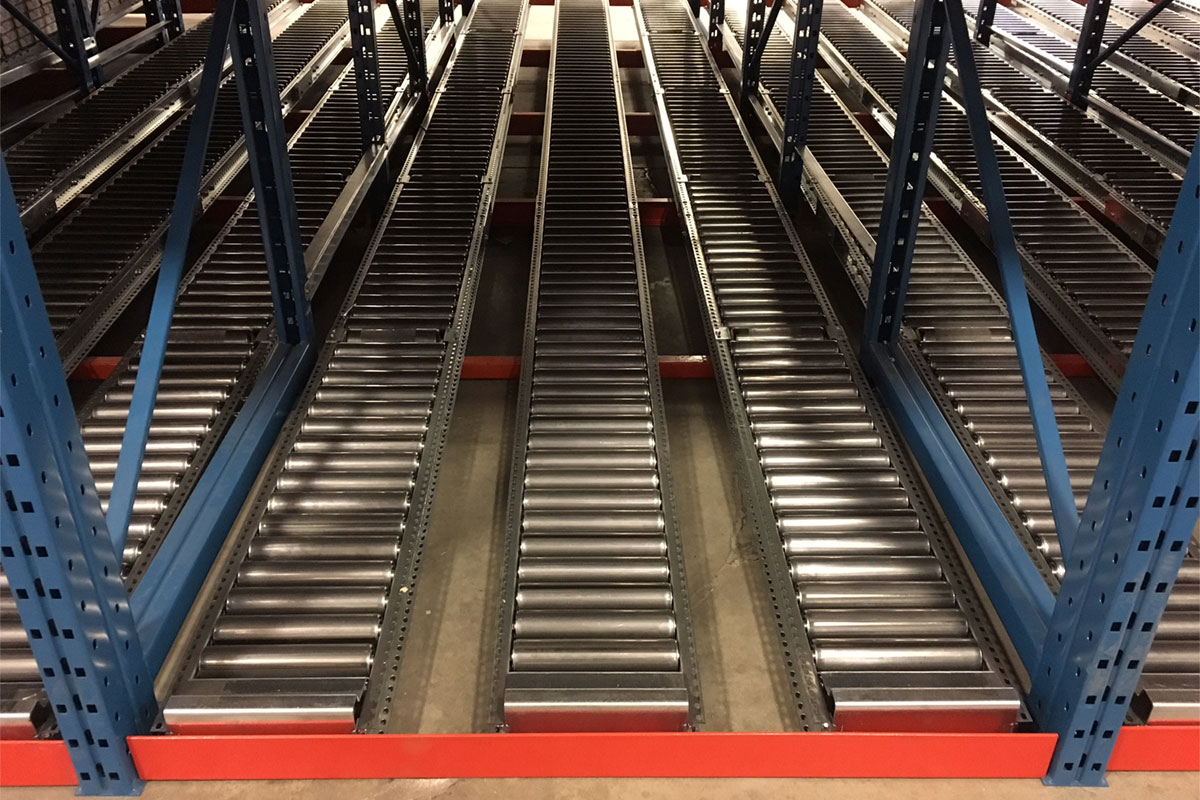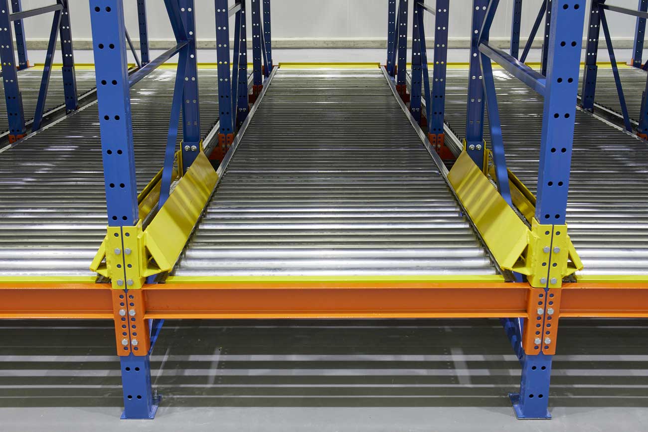 Steel rollers in pallet flow rack systems ensure stability while providing a large load bearing capacity and support for special pallets, steel containers or plastic totes.