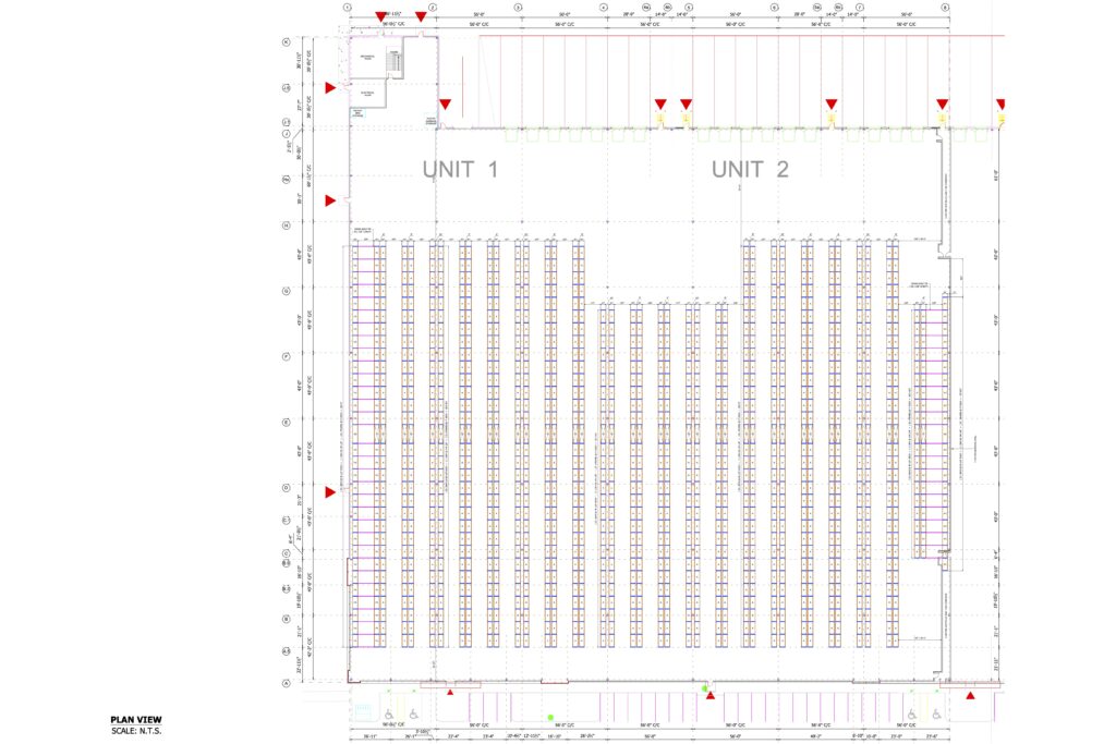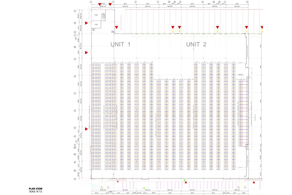 The CAD drawings illustrate two different approaches within the same warehouse footprint. In the first image, in the first building bay, the existing selective racking layout provides 1,860 pallet positions. In the second image, a retrofit to five-deep pushback racking transforms that same area into 3,120 pallet positions — a 68% increase in storage density without expanding the building envelope.