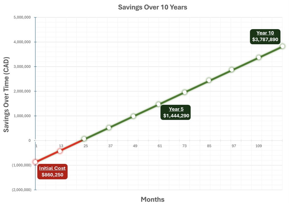A: Less than two years. The payback period works out to about 22 months, after which the system delivers ongoing savings while eliminating the need for external warehousing.